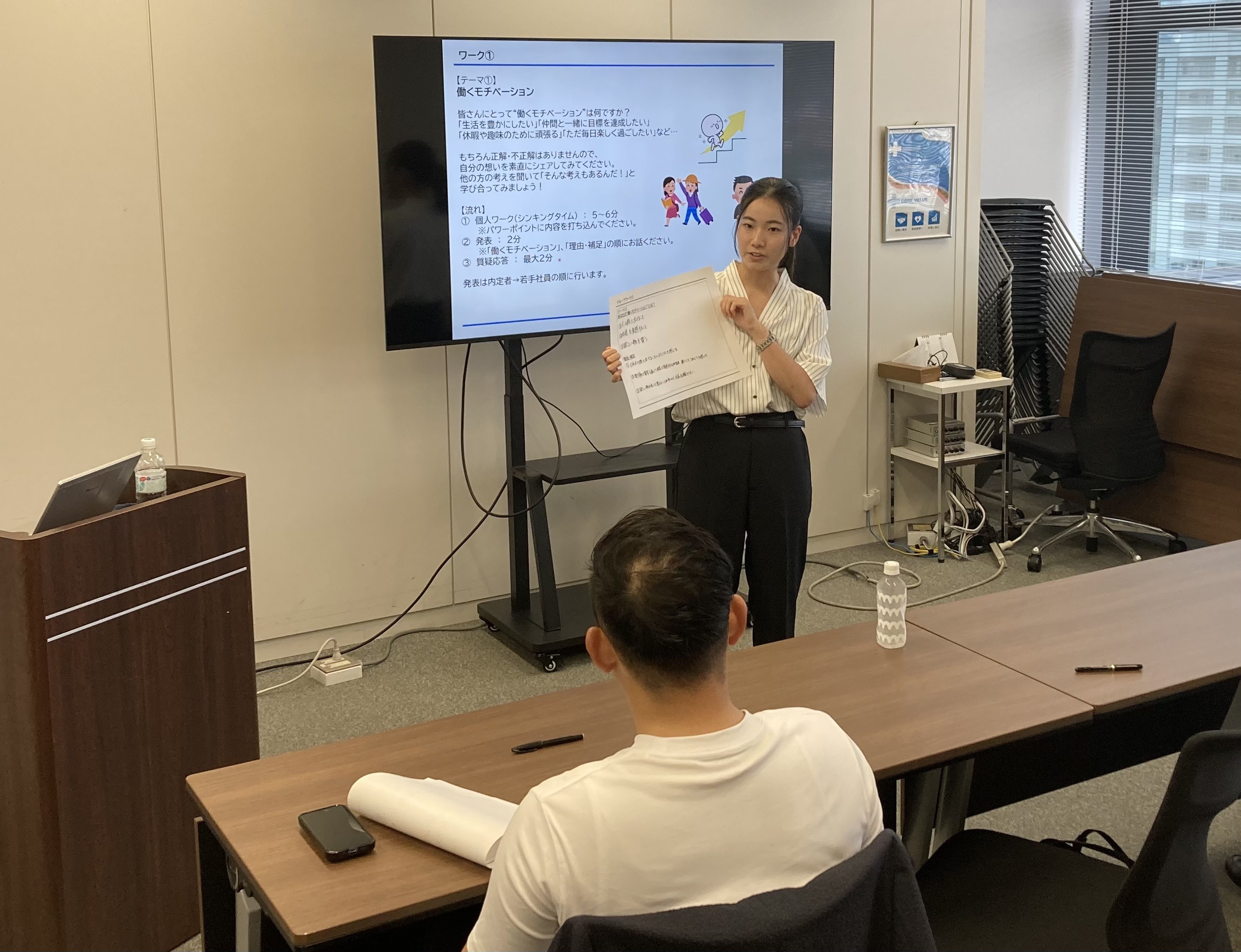 「働くモチベーション」や「成長・やりがいを感じたエピソード」をテーマに、内定者と若手社員が意見交換と発表を行いました。