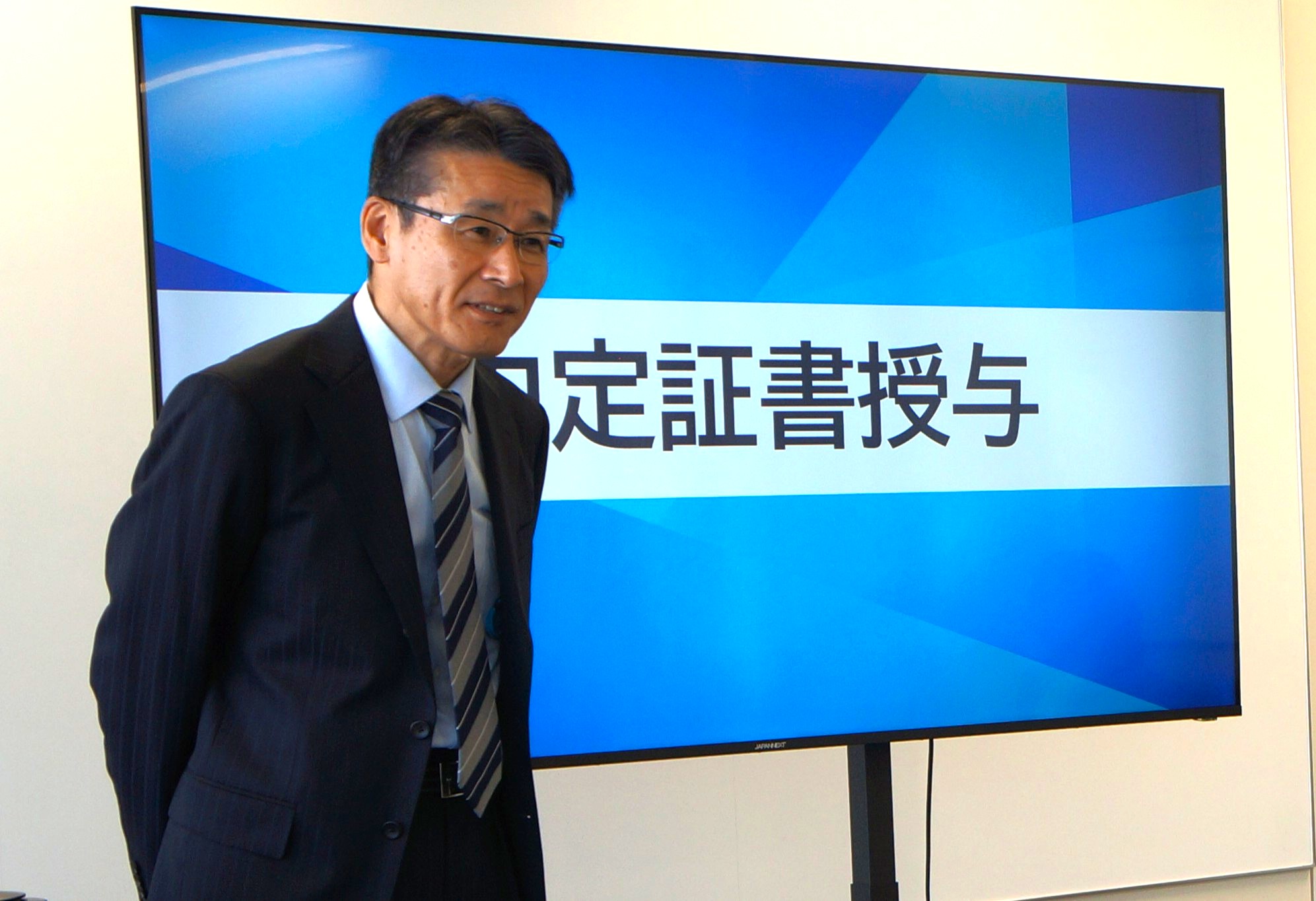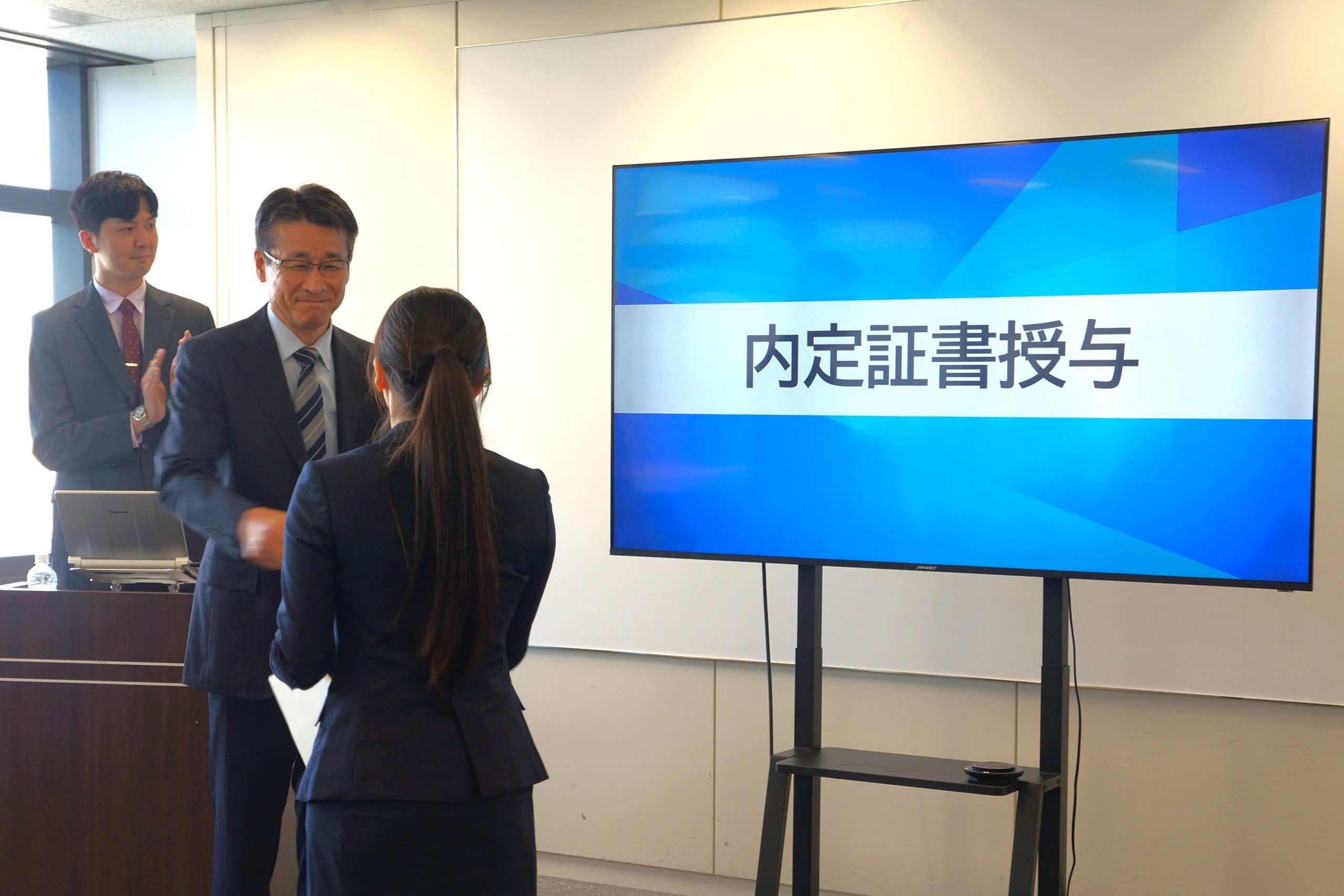 続いて、藤岡社長より内定者一人一人に内定証書が手渡され、内定の祝意と、入社までの心構えや準備についての挨拶が述べられました。